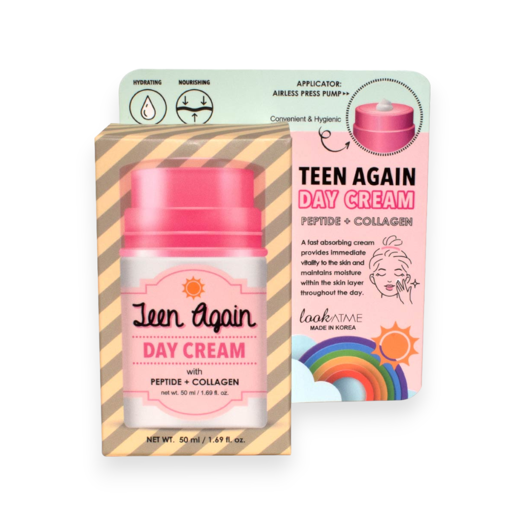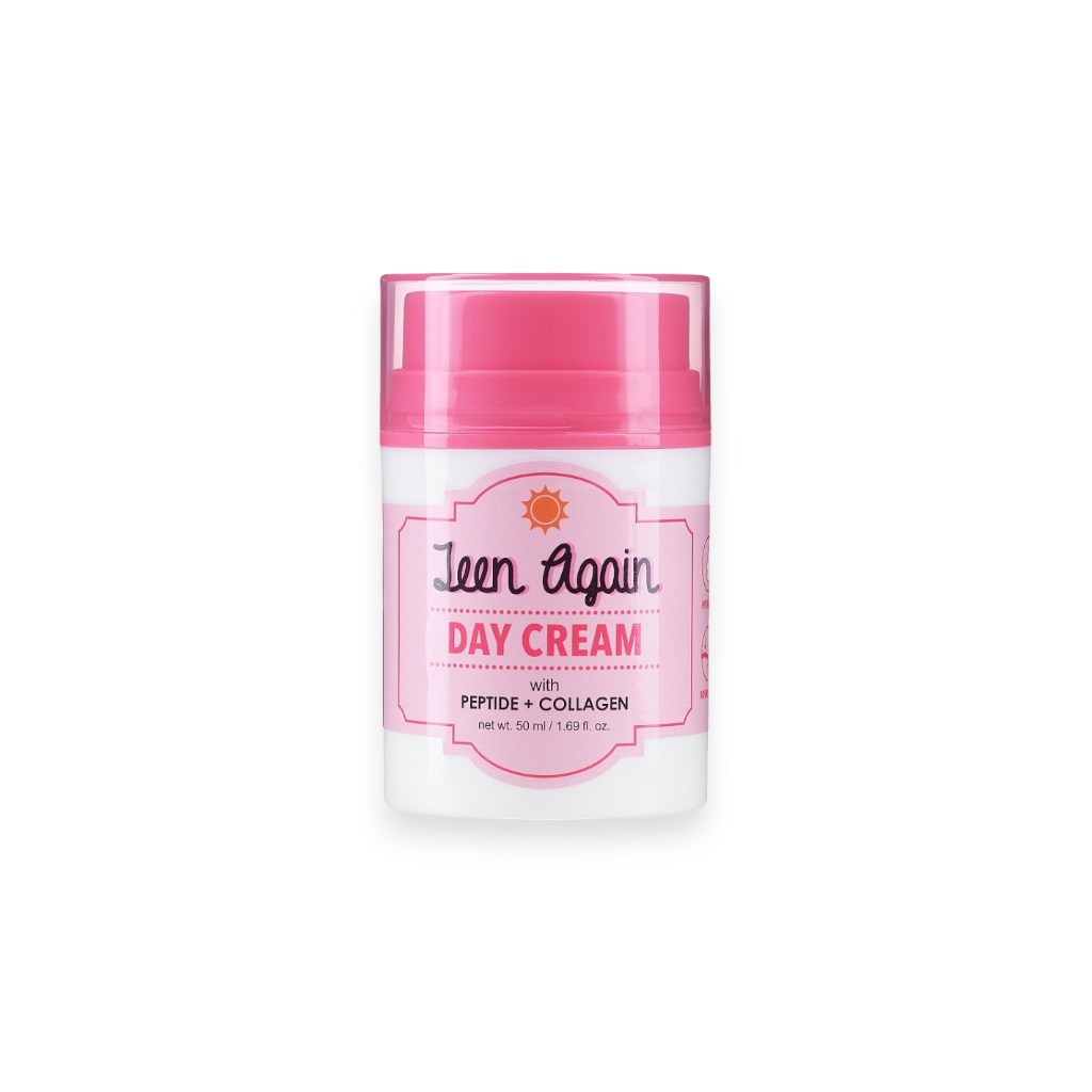 LookATME Teen Again Day Cream je hydratační denní krém obohacený o peptidy a kolagen. Jeho rychle vstřebatelná textura poskytuje pleti okamžitou vitalitu a udržuje hydrataci po celý den. Krém je vybaven pumpičkovým aplikátorem, který zabraňuje kontaminaci a udržuje formuli déle čerstvou. Ideální pro zralou a suchou pleť.